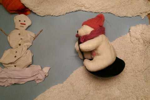 Мишка катается с горки на ледянке